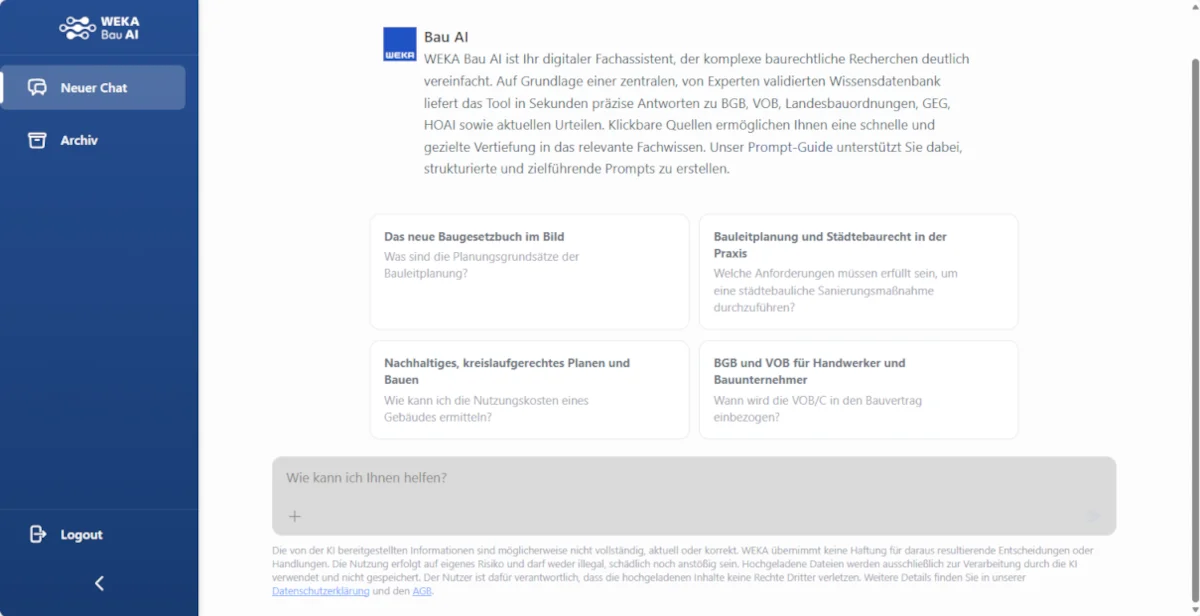 Geben Sie Ihre Frage ein – unsere KI durchsucht tausende Fachbeiträge, Gesetze und Urteile und liefert Ihnen sofort klar strukturierte, praxisrelevante Antworten. Ganz gleich, ob BGB, VOB, HOAI, GEG, BauGB oder Landesbauordnungen – WEKA Bau AI findet die relevanten Informationen, fasst sie präzise zusammen und zeigt Ihnen auf Wunsch die Originalquellen im Volltext an. So arbeiten Sie stets rechtssicher, transparent und auf dem aktuellen Stand!