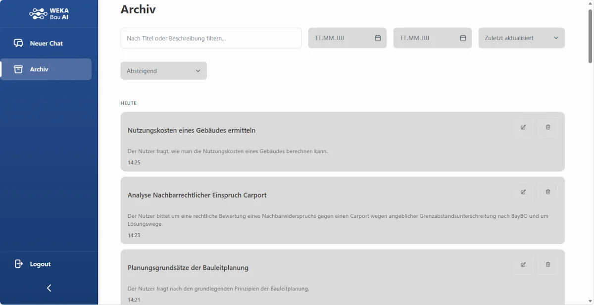 Formulieren Sie einfach Ihre Fragestellung – WEKA Bau AI liefert Ihnen maßgeschneiderte, fundierte und verständliche Antworten, die Sie direkt in Ihre tägliche Arbeit integrieren können.